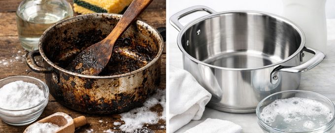 Када је дно тигања прекривено црним слојем загорене каше или џема, немојте журити да га трљате ножем. Постоје методе које растварају загађиваче без механичког утицаја.